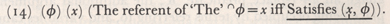 [30] To return to (14): Evans thought that it implied that definite descriptions are not only referring, as has just been discussed, but non-Russellian as well. There is another, potentially more serious difficulty here: if (14) is sufficient to establish the non-Russellian status of definite descriptions, then one can establish, in a similar manner, the non-Russellian status of proper names. This can either be viewed as a direct contradiction of Evans' views on proper names, or (more charitably perhaps) as a reductio ad absurdum of the idea that (14) establishes that definite descriptions are non-Russellian. Consider the recursive truth theory axiom for proper names: